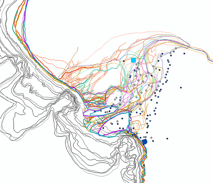 In the map, the colored line networks are a visual representation of the life-story of the lower Abra River from a span of 113 years (1903-2016), and how it is intermingled with the various barrios/barangays (and town center) of Santa. Gearing away towards the concept of framing time with specific periods, the dots in the map correspond to migrations and dissolution of the barangays within 113 years – regardless of whether they were already washed away by floods, relocated to a different location in Santa, or continues to remain at their present sites. The larger sky-blue square symbolizes the former location of the town center, with its shape reflecting its grid street pattern. The navy-blue octagon is the municipal center’s present location and current street pattern. Amorsolo mapped the river and the town as intertwined embodiments to show how these lifeworlds are entangled and interwoven, and how these human and more-than-human entities have life-stories to express equally important and significant ‘facts’ (as non-human bodies like rivers serve to assist as mere backdrops or settings to people’s narratives and experiences). Amorsolo eliminated all that is typically considered as basic map elements one would often see in a map: the map title, labels and legends, scale, directions and arrows, map projection, hypsometric tints, author’s name, date published/created, data references, and borders –all of which can be seen in my river basin map. Just as how in reality, this river-town fluvialscape is bounded by various anthropocentric intrusions –from the mere labeling and categorizing of features on the map to the visual hierarchies between human and more-than-human entities. In removing these map elements, Amorsolo showed how maps can be a tool for ‘unbinding’ anthropocentric mediations into the more-than-human and landscapes.