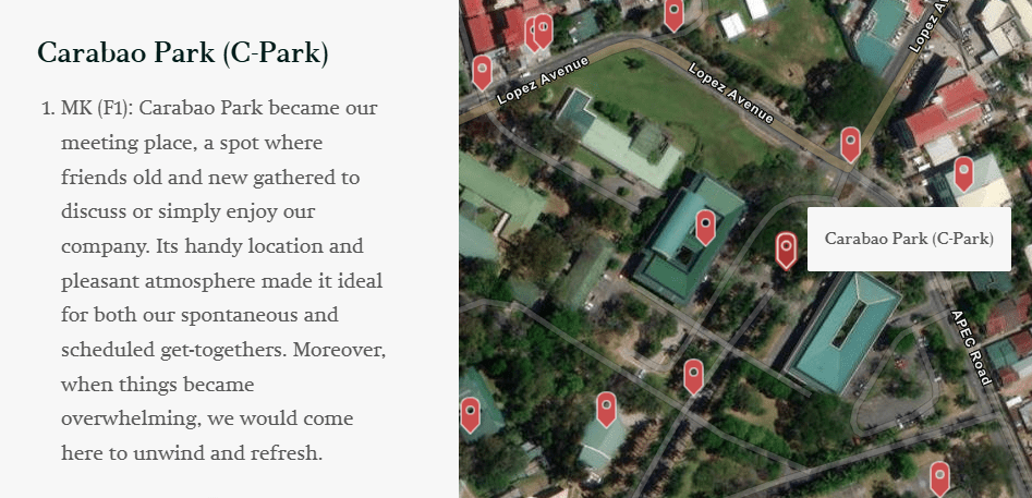 Beyond presenting the relationship between geography and history, these story maps allow participants and readers to rethink the idea and sense of place through shared or unique experiences. They uncover layers of meaning about campus locations beyond their official names or stories. In turn, these personal narratives enrich the history of the campus, offering insights not always captured in official documents or other types of maps. While buildings form the physical aspect of the UPLB campus, what makes it memorable for its students and alumni are the stories created with and within these spaces.